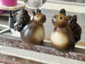 Denne lille keramiske størrelse med det friske navn ”Egon” er blevet til på keramikerens værksted efter en fantastisk oplevelse med de kære dyr. På en skovtur i det svenske blev keramiker med frue overfaldet af hele 7 herlige små egern. En mor med 6 små lystige egernunger, som manglede al form for fornuftig opdragelse. De bare kravlede og forvildede sig op og ned af parret, der stod som paralyserede.